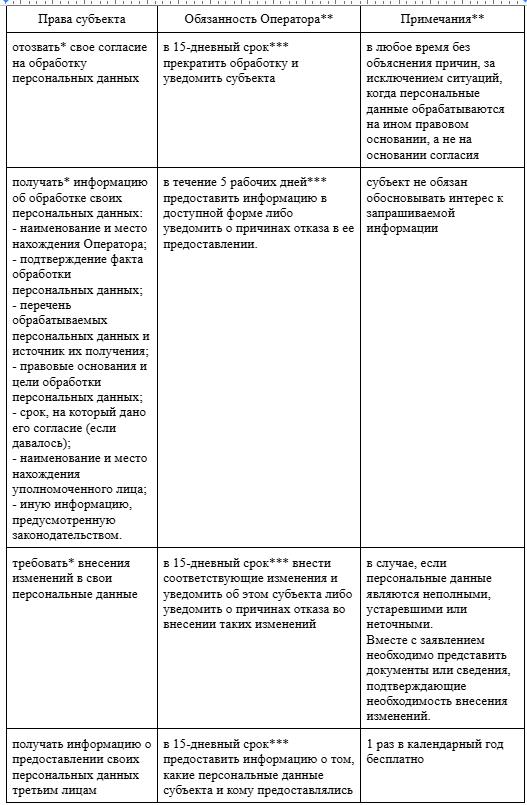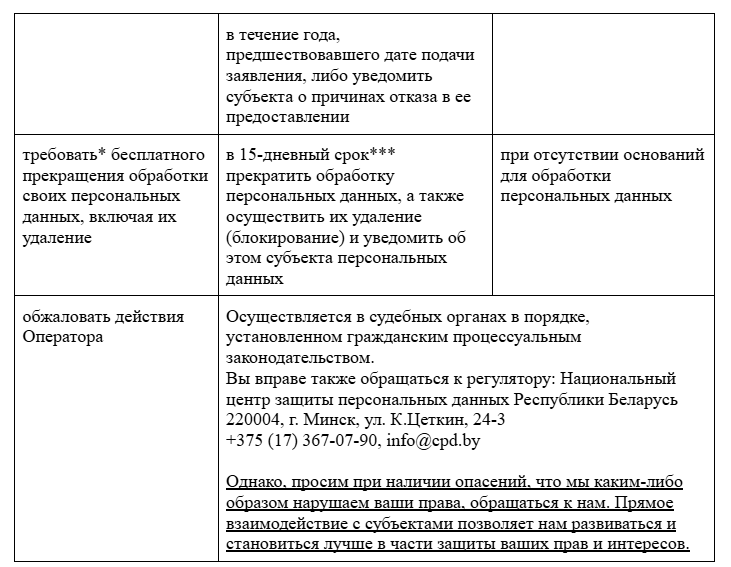 *** сроки исполнения обязательств исчисляются со дня следующего после получения соответствующего заявления субъекта персональных данных, если иной срок не установлен законодательными актами.