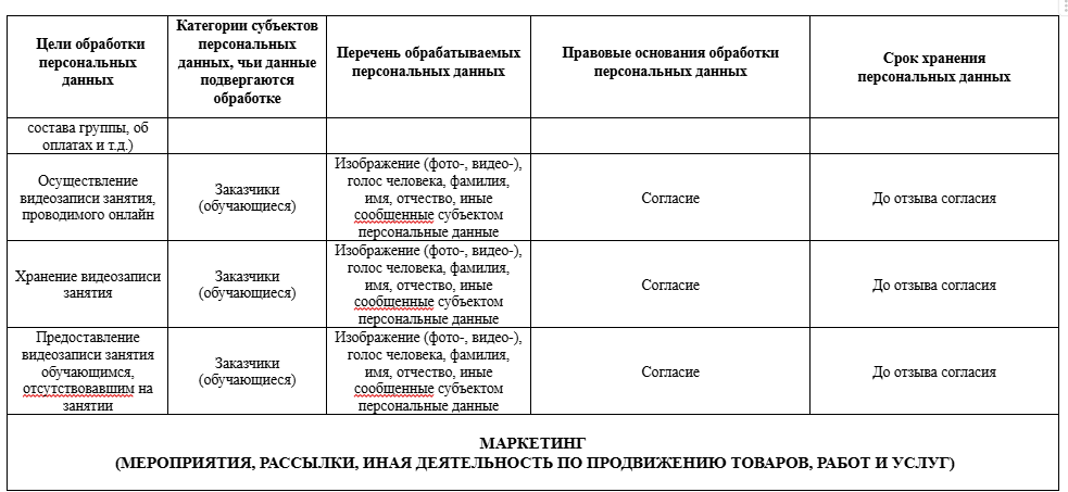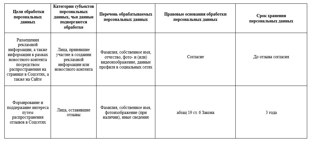 2.2.1. фамилия, собственное имя, фото- и видеоизображение, данные профиля в социальных сетях, иные сведения для целей размещения рекламной информации, а также информации в рамках новостного контента в социальных сетях посредством распространения на страницах в Соцсетях, а также на Сайте на основании согласия.