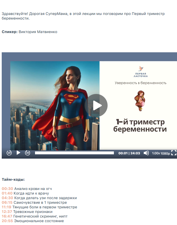 Этот курс о том, как прожить беременность без тревоги и устаревших советов, получить четкие инструкции от практикующего акушера-гинеколога и чувствовать себя уверенно каждый день до родов! Курс «Уверенность в Беременность» состоит из 20 видеоуроков по актуальным темам беременности. Лекции содержат современную информацию и международные рекомендации, поэтому наш курс будет актуален для любой страны, в которой Вы проживаете!